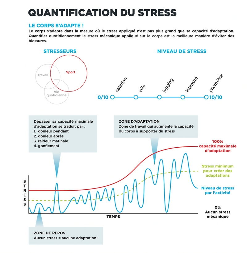 L’idéal est de stresser minimalement le corps, de façon régulière pour favoriser des phénomènes d’adaptation et de renforcement de l’organisme. Il faut éviter de franchir la capacité maximale d’adaptation au risque de se blesser. L’inactivité est également à proscrire car elle est source de désadaptation et d’encaissement minimale de stress mécanique. L’image ci-dessous, tirée de la clinique du coureur, illustre parfaitement la logique de cette quantification du stress mécanique.